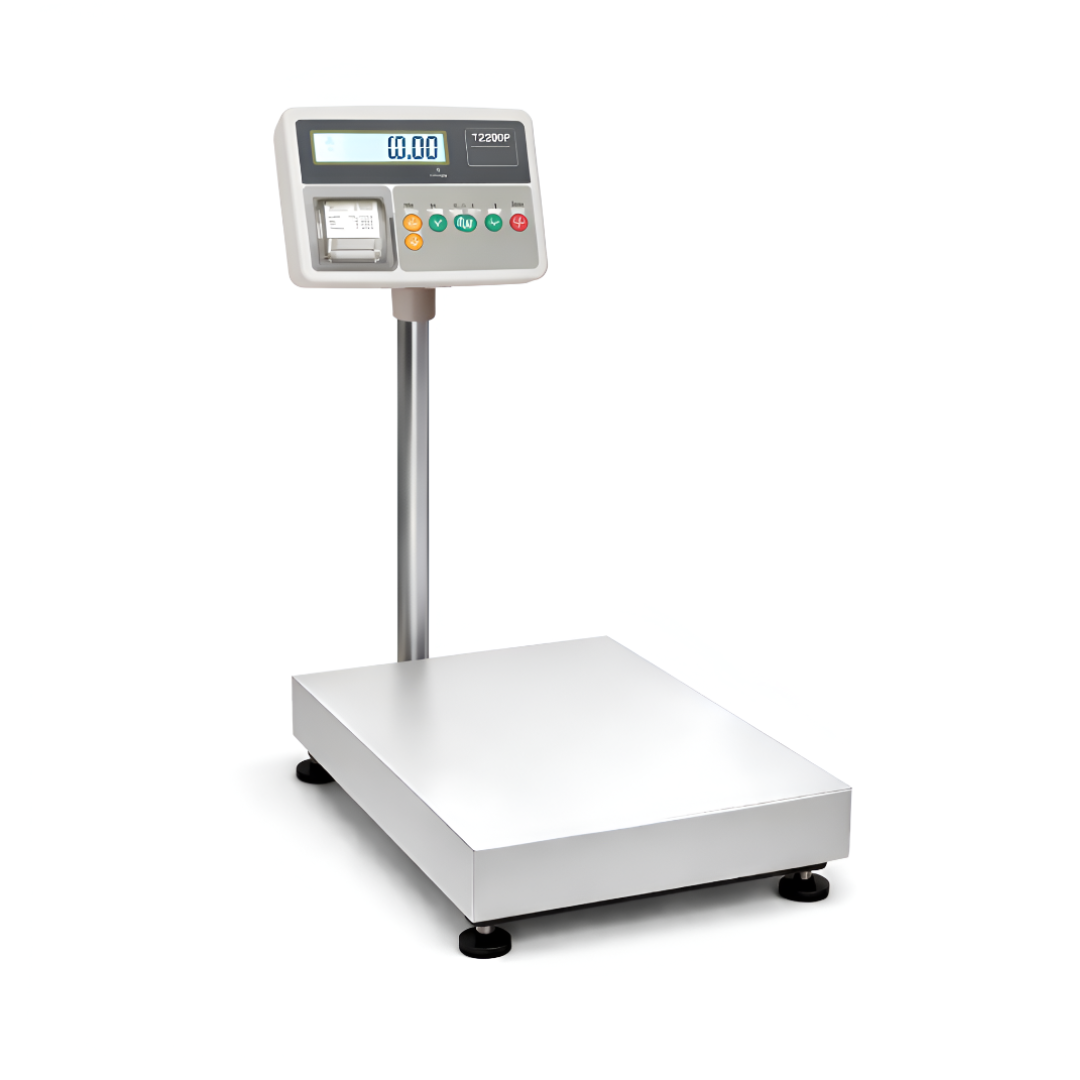 Balanza de piso con plataforma e indicador con impresor: Báscula de piso con plataforma de acero y cabezal T-Scale T2200P, ideal para almacenes y plantas industriales. Permite un pesaje preciso y la impresión inmediata de tickets, facilitando el control y registro de operaciones. Diseñada para uso intensivo, ofrece resistencia, estabilidad y múltiples funciones de pesaje para optimizar procesos logísticos.